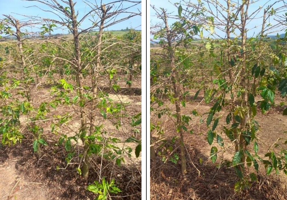 Recentemente, uma pesquisa foi realizada para estudar o efeito da condução de diferentes números de hastes após à poda de esqueletamento. Foram conduzidos dois ensaios em Espírito Santo do Pinhal (SP), no período 2023/2024, em área com altitude de 900 m, em lavouras de catuaí e mundo novo. As características das lavouras utilizadas foram: a catuaí IAC 144, no espaçamento 3,5 X 0,5 m, 10 anos de idade, e mundo novo 379/19, espaçamento 3,4 x 0,7 m, 10 anos de idade. Os tratamentos constaram da condução com manutenção de 1 a 4 hastes por planta, no pós poda de esqueletamento. A poda foi realizada em agosto de 2023 e a altura de corte superior foi a 2 m. A avaliação foi feita através da colheita em 2025, sendo realizada análise estatística.