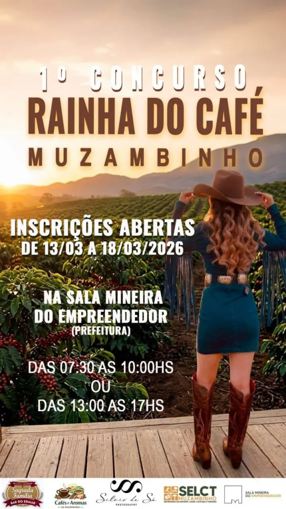 Estão abertas em Muzambinho as inscrições para o 1º Concurso Rainha do Café, iniciativa que busca valorizar a tradição cafeeira do município e destacar jovens que representem com simpatia, elegância e orgulho a cultura local. As interessadas poderão se inscrever entre os dias 13 e 18 de março de 2026.