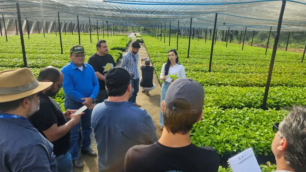 Legenda: Empresários e técnicos da Missão da Faec visitam em Cacoal (RO) as estufas nas quais se desenvolvem as mudas do café Robusta