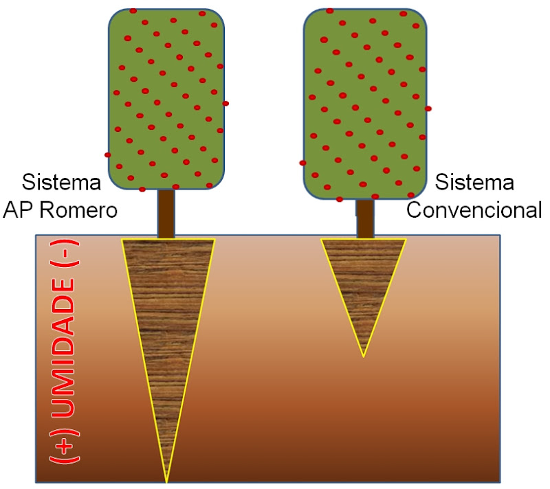 De acordo com o vídeo e os depoimentos dos agrônomos, pesquisadores e professores o Sistema AP Romero atinge profundidades maiores de sistema radicular do que o Sistema convencional, fazendo com que o cafeeiro acesse a água ou a umidade mesmo em um período de seca, pois a água permanece disponível nas camadas mais profundas.