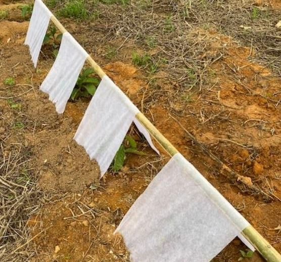 Um outro sistema consiste em usar cobertura individual da cova, com tiras de TNT de cerca de 20 cm de largura, presas no alto com grampos em um bambu, dobradas sobre ele e presas embaixo com terra junto ao solo (ver ilustração).