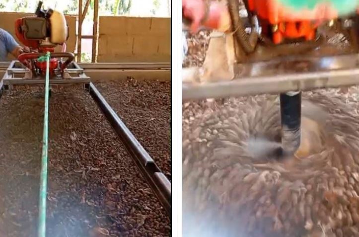 Para resolver este problema, foi desenvolvido um sistema simples para revirar os frutos e uniformizar a secagem. O sistema consta de uma pequena plataforma onde é fixado um perfurador de solo, motorizado, que possui uma rosca sem fim. Esse conjunto se move sobre um perfil de aço em forma de U. O movimento se dá através de rodinhas que se encaixam no vão do perfil. Assim, o perfurador se movimenta ao longo e na lateral da barcaça. O movimento é feito através de uma corda puxada manualmente.